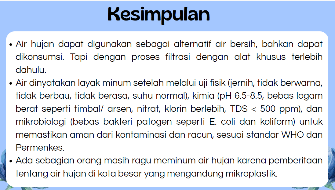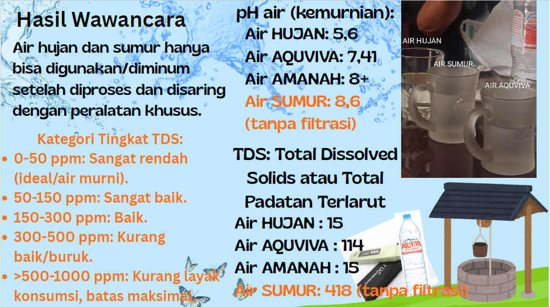 Dari wawancara, kami tahu bahwa air hujan dapat digunakan sebagai alternatif air bersih setelah difiltrasi.